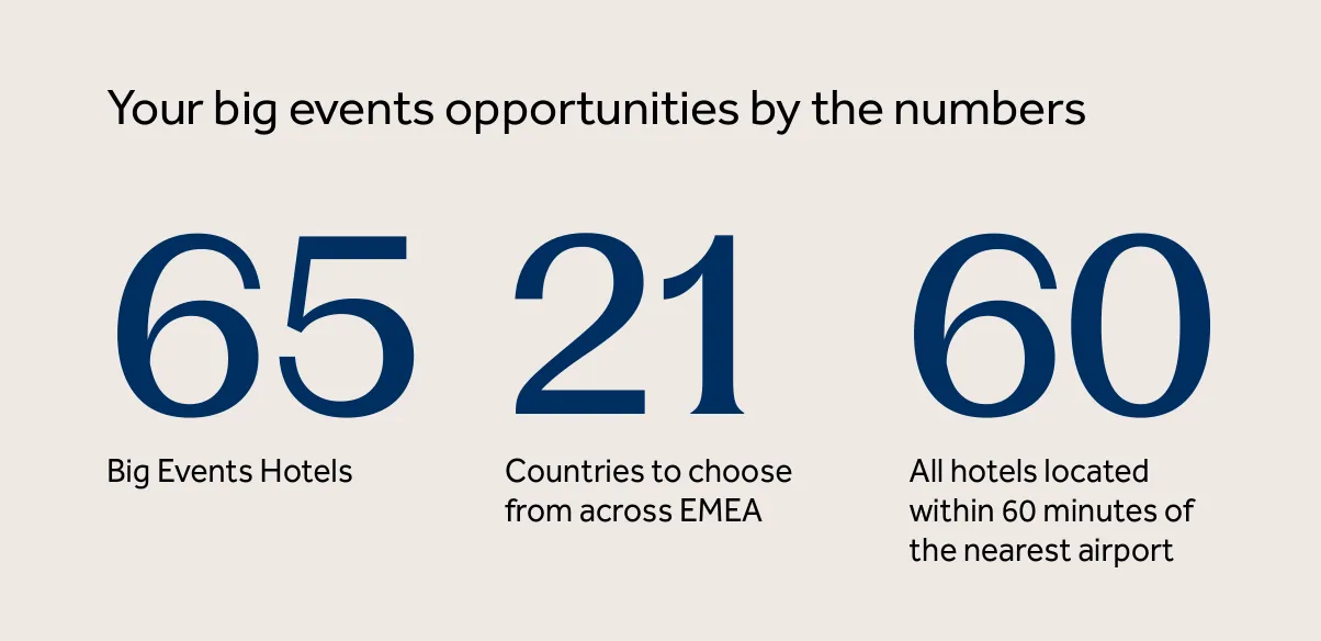 For more information on the Big Events offer, contact your Hilton Worldwide Sales representative or your hotel representative.